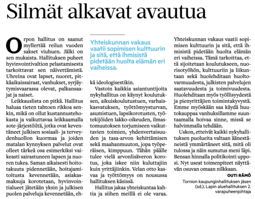 Silmät alkavat avautua, Outi Rämö 28.8.2024 Lapin Kansa